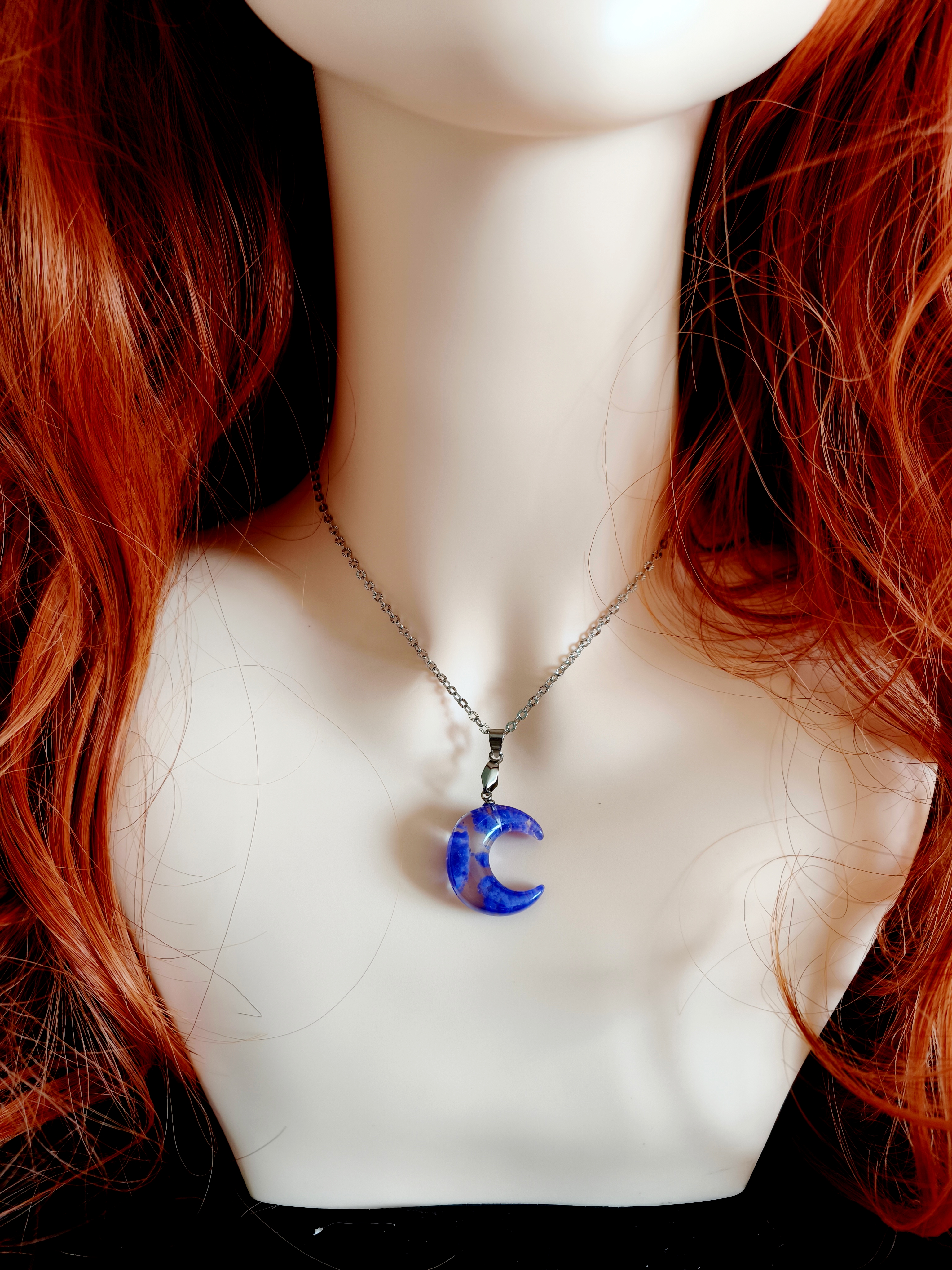 Forgé dans l’ombre d’un croissant d’argent, ce pendentif capture la danse silencieuse des rêves oubliés. La lune, froide et altière, y est sertie de nuages violets — vapeurs d’éther volées aux songes des sorcières. Porté contre la peau, il ouvre les portes de l’imaginaire, où la nuit murmure et les étoiles conspirent en silence.