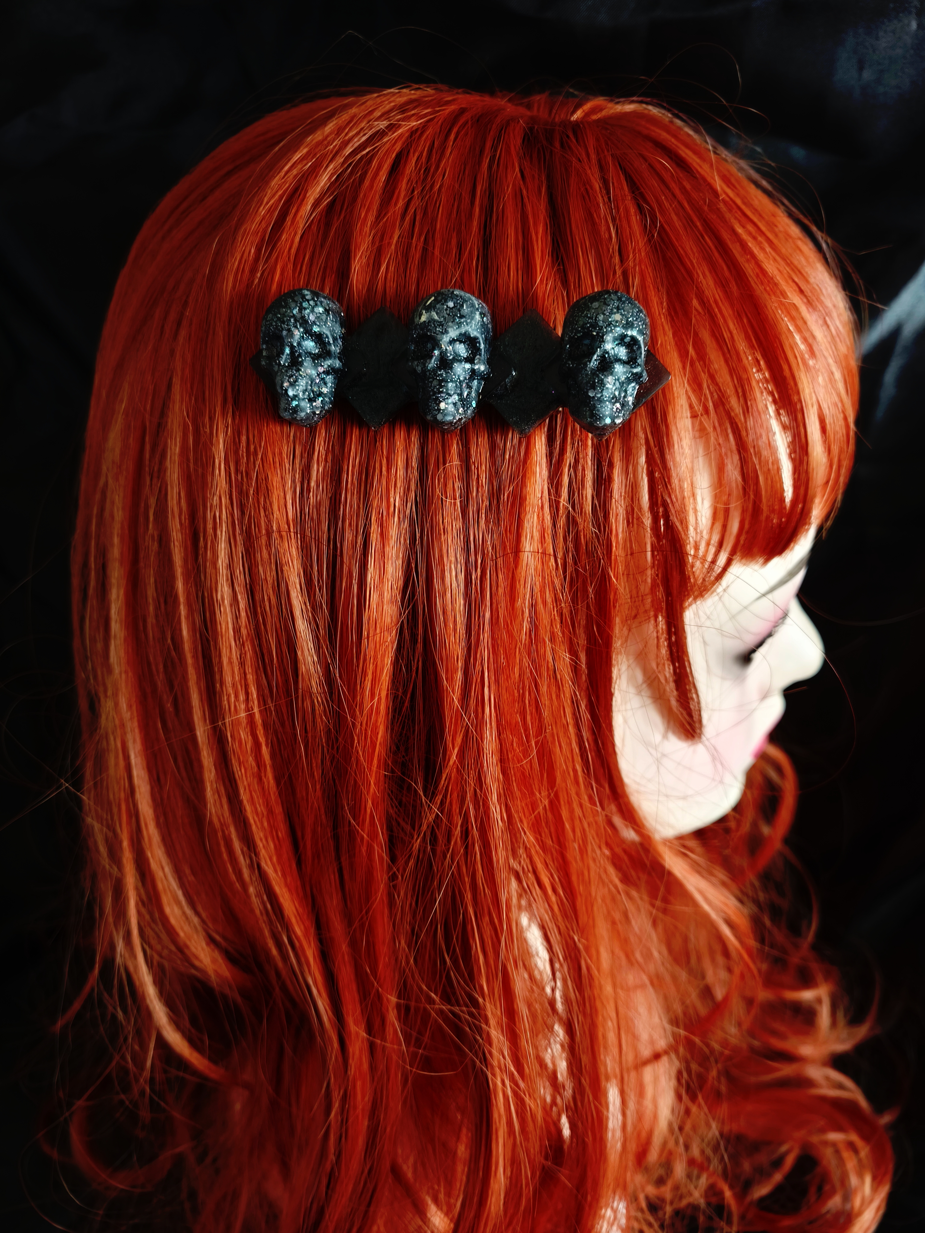 Dans l'ombre profonde, cette pince noire, ornée de trois têtes de mort ébène, incarne l'élégance macabre et mystérieuse. Chaque crâne, figé dans un éternel silence, semble murmurer des secrets...